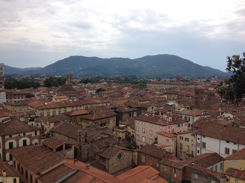 The one attraction we enjoyed was climbing Lucca’s signature tower, the Giungi Tower. This tower is one of two open to the public for climbing to the top, an activity which yields beautiful views of the city, as well as of the surrounding Tuscan mountains. What makes this tower unique is that it is topped by a stand of oak trees. Though they have been replanted over the years, oak trees have been known to grow at the top of that tower for hundreds of years (as evidenced by depictions of the town in frescoes and paintings).