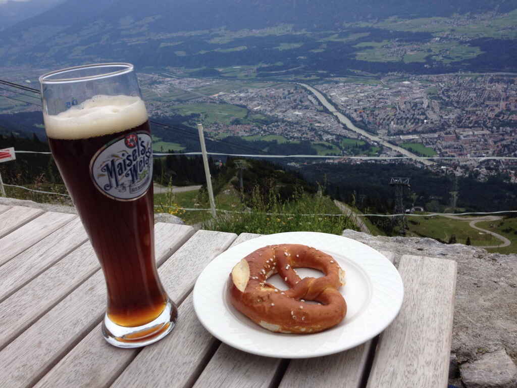 We made our way down to Seegrube, which was the station approximately 2/3s (probably close to 2km above sea level) of the way up the mountain, and sat down to look over Innsbruck one last time. I enjoyed an Austrian beer (don’t worry, it was past noon) and a pretzel, and Cara savoured an ice cold Coke. We then hopped back on the bahnen and left that place, which, seemed so close to the sky.